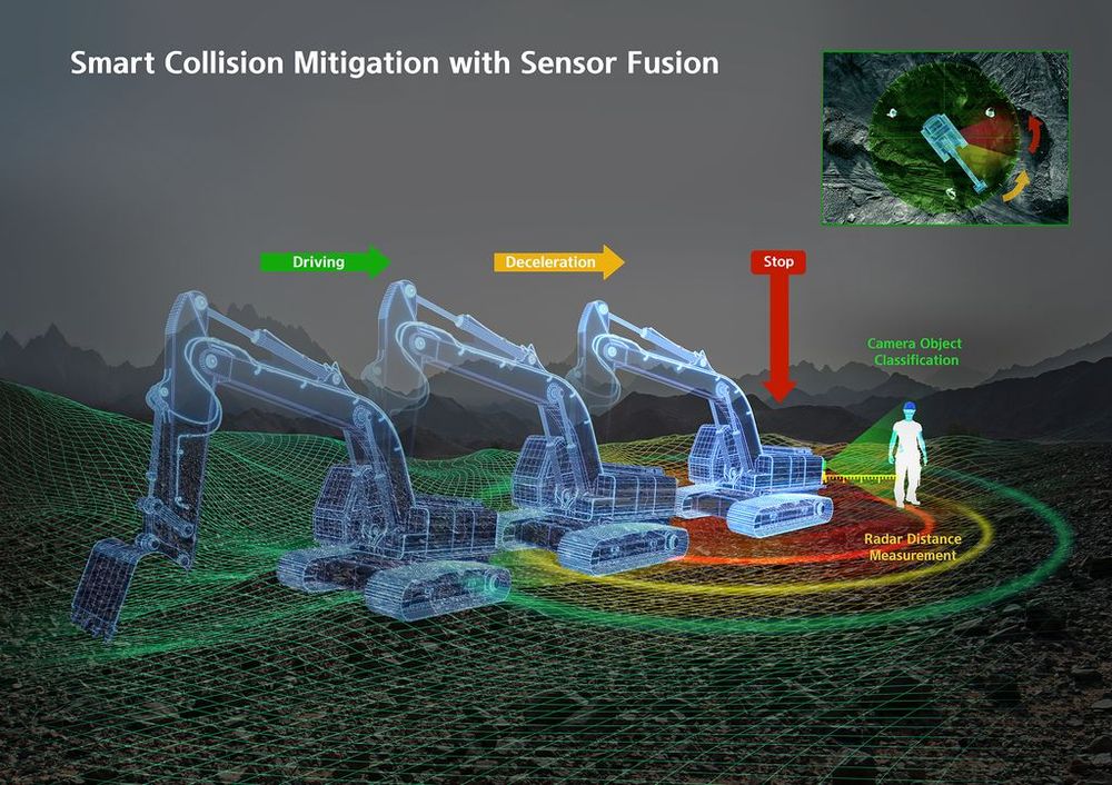 La SMART COLLISION MITIGATION (SCM) è un sistema di sicurezza attivo che rileva gli oggetti attorno a un escavatore attraverso la fusione di due tecnologie: telecamere e radar. L’escavatore è dotato di quattro o più telecamere per fornire una visione panoramica a 360 gradi. Utilizzando la tecnologia AI, può rilevare selettivamente persone o oggetti.