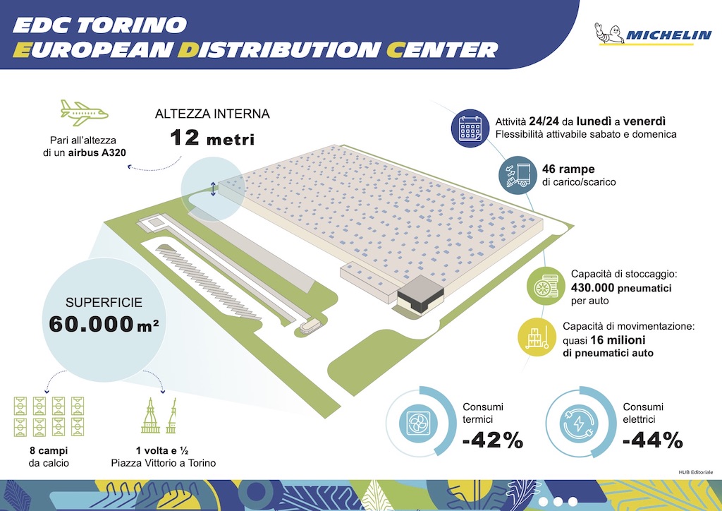 Ha una capacità di stoccaggio equivalente a 430.000 pneumatici vettura e una capacità di movimentazione di 150.000 tonnellate/anno, vale a dire quasi 16 milioni di pneumatici vettura e 12.500 camion che transitano dal magazzino per servire tutto il nord Italia, dal Piemonte al Friuli-Venezia Giulia, fino a Emilia-Romagna e Toscana. Il resto della penisola è invece servito dall’altro European Distribution Center Michelin di Pomezia, in provincia di Roma.