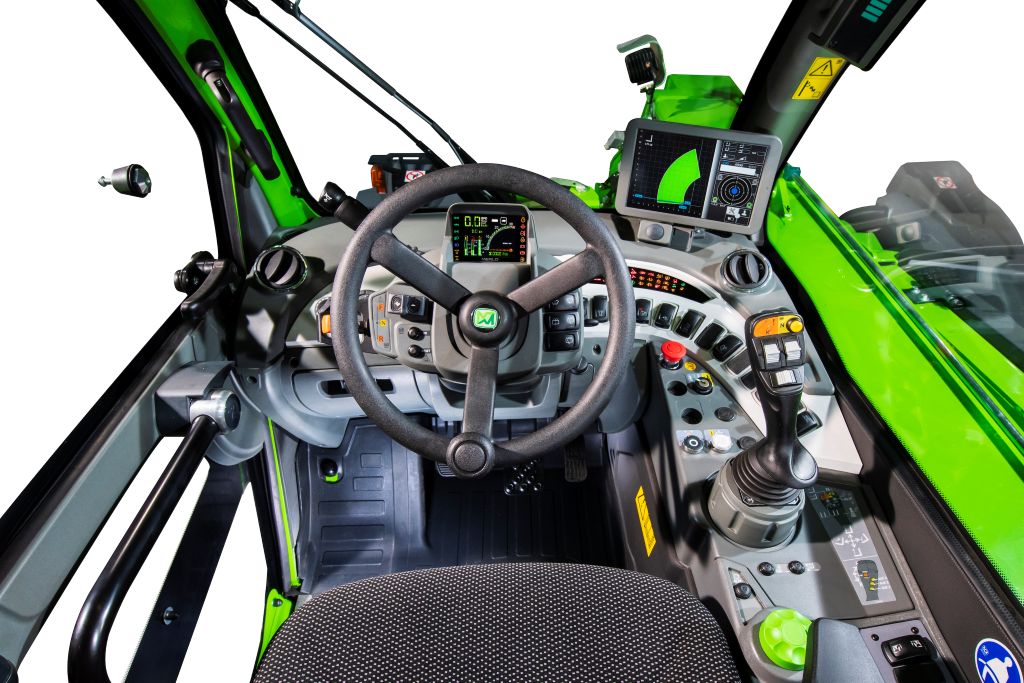 Tra le caratteristiche distintive troviamo inoltre la cabina sospesa idropneumatica Merlo, che garantisce un comfort straordinario anche nelle lunghe ore di lavoro su terreni accidentati. A questo, in cabina, si aggiunge il display digitale ASCS, che include un sistema di pesatura in tempo reale per monitorare il peso del carico sollevato, migliorando la sicurezza e l’efficienza operativa.