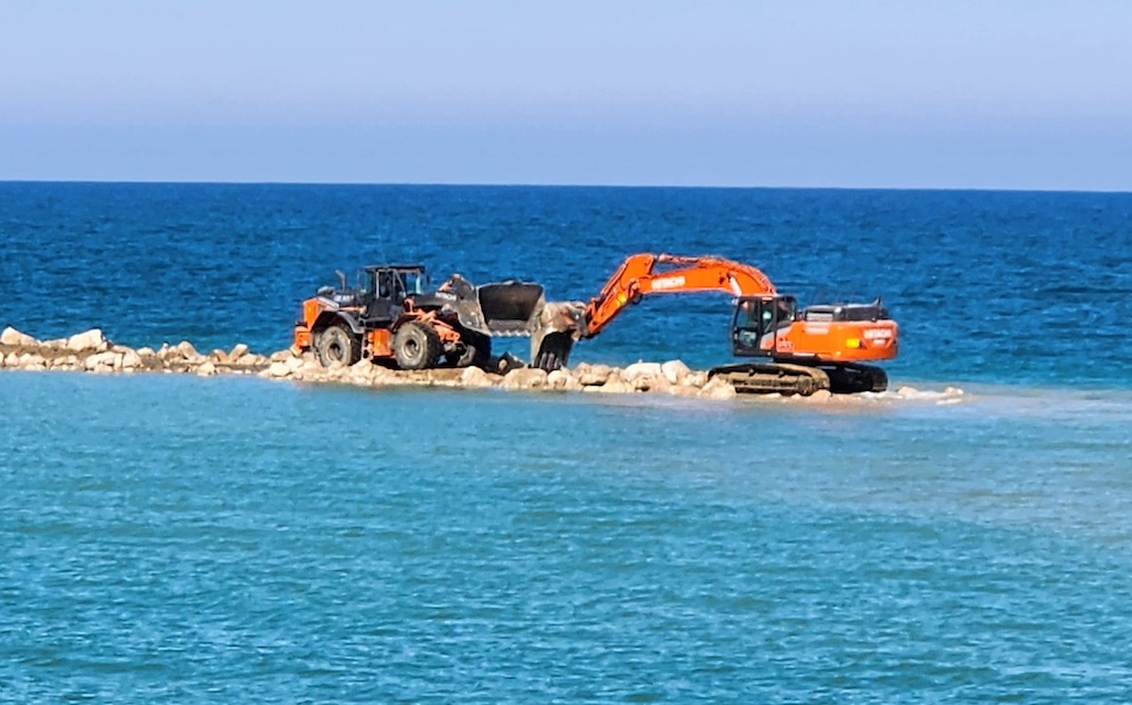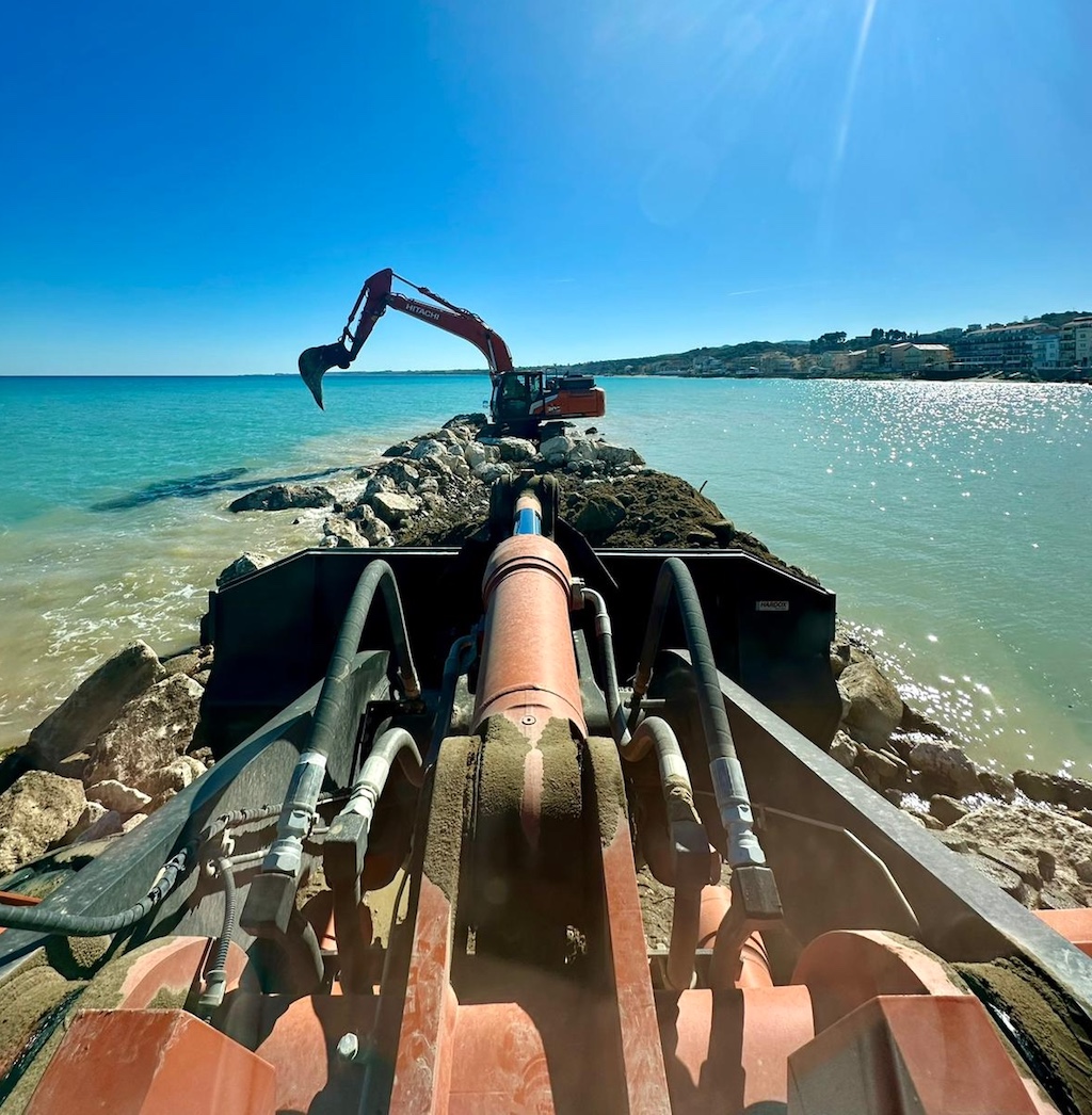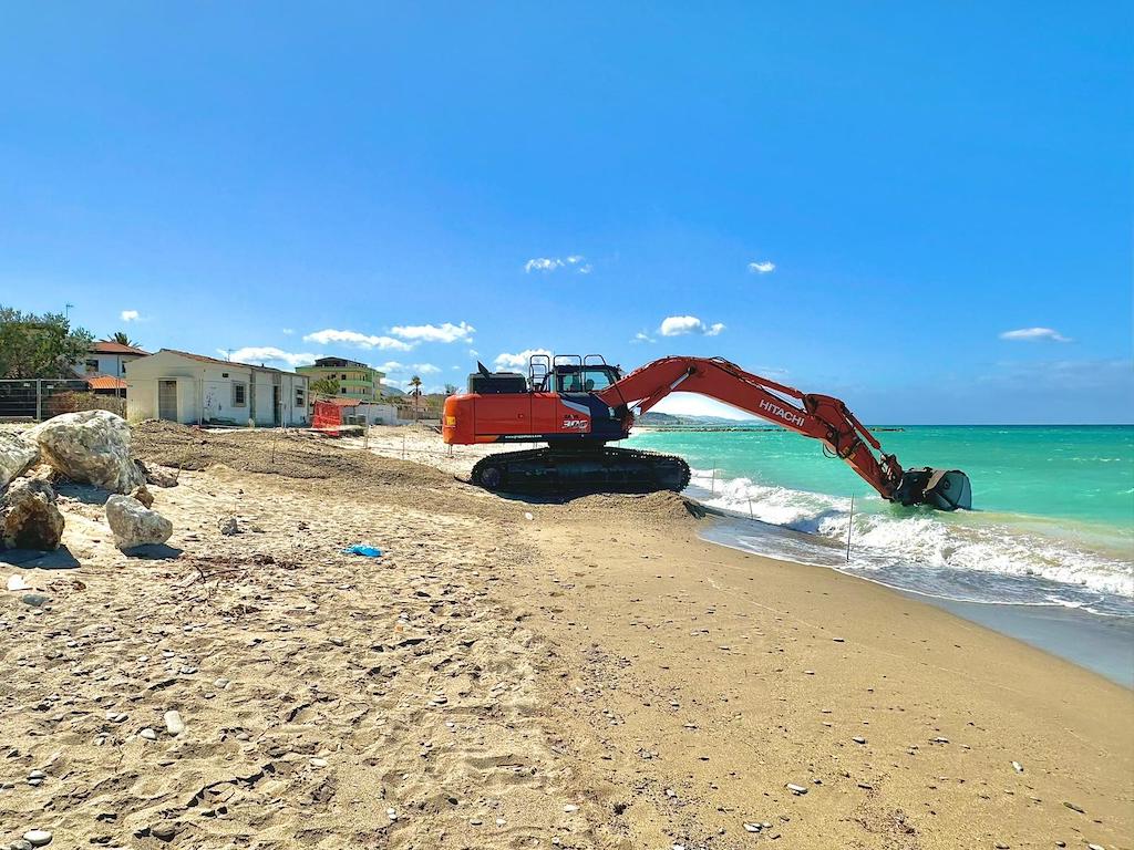 Le lavorazioni hanno riguardato la realizzazione di scogliere e opere di protezione del litorale, con movimentazione e posa di massi di grande pezzatura e modellazione dei rilevati di base. Anche in quest’occasione gli escavatori Hitachi ZX300 e ZX240 insieme alle pale ZW180 e ZW250 sono stati impiegati sia per la preparazione del piano di posa sia per il posizionamento dei materiali, operando direttamente sulla battigia e, in alcune fasi, su rilevati provvisori realizzati in mare.