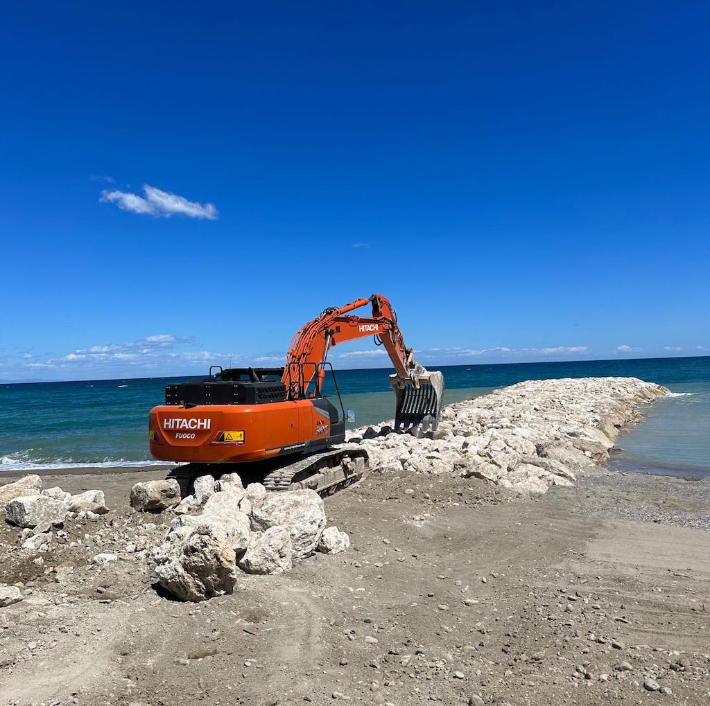 In questo contesto sono stati impiegati escavatori Hitachi di grande classe operativa, tra cui lo ZX300, utilizzato sia per la preparazione del sottofondo sia per il posizionamento dei materiali destinati alla realizzazione delle scogliere. Le macchine hanno lavorato dalla battigia e anche direttamente in acqua, operando in condizioni che richiedono grande affidabilità dei componenti, buona visibilità e movimenti idraulici precisi, elementi fondamentali per la corretta posa dei massi e la formazione delle strutture di difesa.