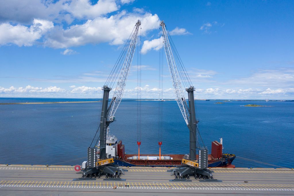Due gru mobili da porto LHM 800 Liebherr lavorano in tandem nel porto di San Pietroburgo (Russia). Insieme, le due macchine possono movimentare un carico che raggiunge le 616 tonnellate.