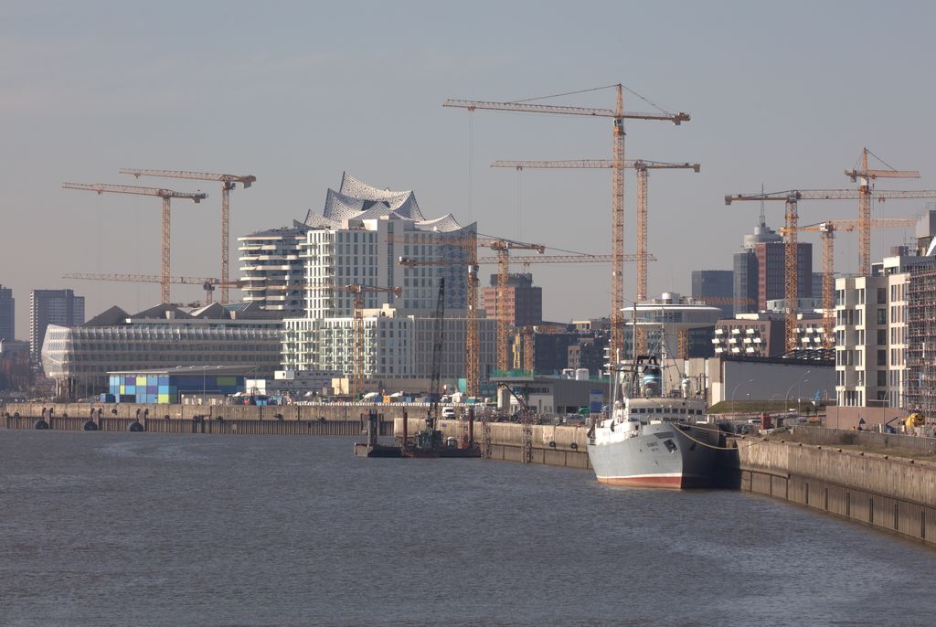 Capolavoro della logistica: 25 gru a torre Liebherr al lavoro nell’area Überseequartier del quartiere Hafencity ad Amburgo.