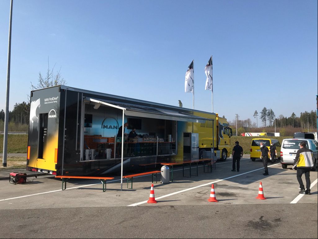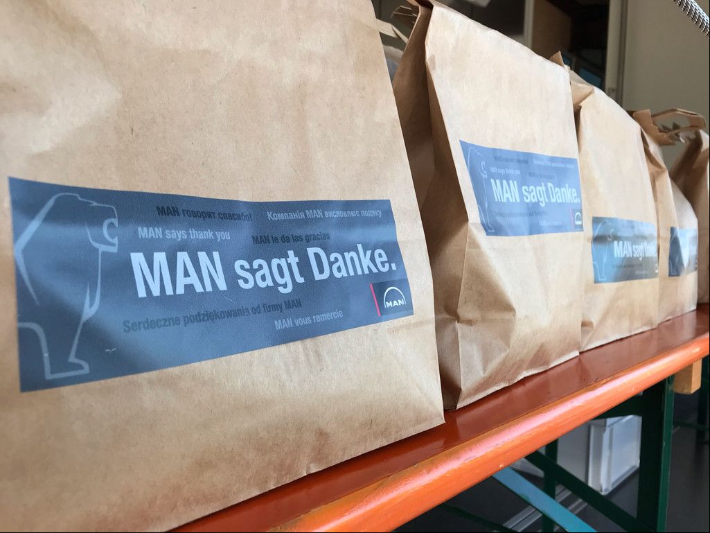 Al motto di “MAN vi dice Grazie” il team MAN ProfiDrive, generalmente impegnato nella gestione dei corsi di guida presso le aziende clienti, ha volontariamente dedicato due giornate alla distribuzione gratuita di più di 1000 buste con il pranzo a tutti gli autisti presenti nell’area di sosta degli snodi autostradali A8 e A9 in prossimità di Monaco di Baviera.