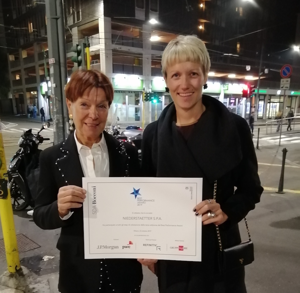 Il Best Performance Award 2019 è un’iniziativa giunta alla terza edizione con la finalità di premiare le migliori aziende che creano valore economico, tecnologico, umano, sociale e ambientale, operando in modo complessivamente sostenibile. Il Premio è organizzato dalla SDA Bocconi School of Management insieme alla J.P. Morgan Private Bank, la PwC, la Refinitiv e il Gruppo 24 ORE e rappresenta l’eccellenza delle imprese italiane. O come spiega Riccardo Pironti, Head of J.P. Morgan Private Bank, “Oggi più che mai l’imprenditoria italiana è la spina dorsale della nostra economia ed è un momento unico per noi ridare qualche cosa a questi uomini e donne straordinarie”. Niederstätter si è posizionata tra i 63 finalisti tra 500.000 aziende italiane.
