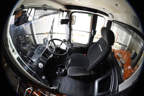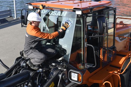 Alcune di queste nuove dotazioni migliorano sicurezza e visibilità dentro e attorno alla cabina. Per esempio, un nuovo corrimano a tre punti di presa è stato installato attorno al tetto della cabina. Consente all’operatore di muoversi in tutta sicurezza lungo la torretta per pulire la finestratura ed eseguire altre attività.