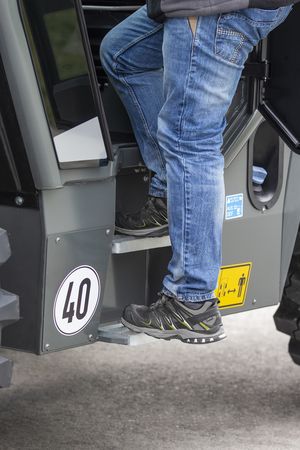 Con una rientranza nel pavimento della cabina e la disposizione a gradini delle scale, l’agevole entrata in cabina garantisce maggiore sicurezza e comfort per tutti i veicoli. Per un livello di rumore più basso è stata installata una cosiddetta pompa Silence, che riduce il livello di rumore dei modelli da KT306 a KT559 a soli 72 decibel (A) nella cabina. Gli attuali aggiornamenti del modello includono anche l’introduzione di un bracciolo sinistro per un maggiore comfort, ad esempio per lunghi viaggi su strada. Oltre alle funzioni di comfort sopra citate, i modelli con da KT306 a KT559 guadagnano punti con il quarto tipo di sterzo, lo “sterzo a granchio flessibile”. L’assale posteriore è bloccato, ma l’assale anteriore rimane liberamente sterzante. Il sistema di assistenza alla guida “Smart Handling” con le sue tre modalità di funzionamento garantisce anche un lavoro più rapido e una maggiore sicurezza. Il joystick attaccato al sedile dell’operatore consente una guida ergonomica nell’uso quotidiano. La ben nota e robusta piastra a sgancio rapido Kramer su questa macchina garantisce inoltre che gli attrezzi possano essere cambiati in modo rapido ed efficiente.