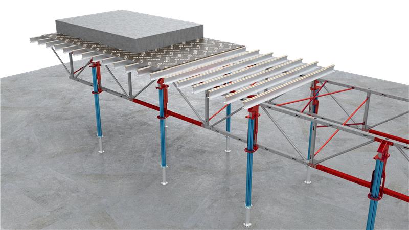 Il sistema si distingue per un approccio operativo estremamente snello: una volta assemblato, il tavolo viene traslato e riposizionato tramite gru, configurandosi come la soluzione ideale per massimizzare la produttività nel getto di grandi superfici regolari in edifici multipiano. La struttura portante si basa su una orditura primaria in travi reticolari di acciaio da 110 cm, integrata da una secondaria in legno PL20 o alluminio e sostenuta da puntelli Slabprop 2.0 ad alta portata o torri di sostegno Simplex e MP HD.