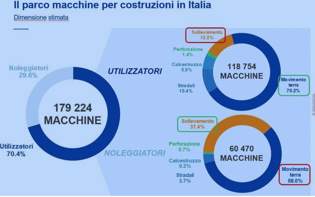 Il parco macchine per costruzioni, stimato in 179.224 mezzi, è composto principalmente da macchine per il movimento terra (66,1%), per il sollevamento (20,7%), stradali (8,2%), per il calcestruzzo (4%) e quelle per la perforazione (1,1%). In media, il 30% di questi mezzi fa capo ai noleggiatori, con rilevanti distinzioni tra le diverse tipologie di macchine: il peso del parco noleggio spazia dal 61% dei mezzi per il sollevamento al 2% di quelli per il calcestruzzo.