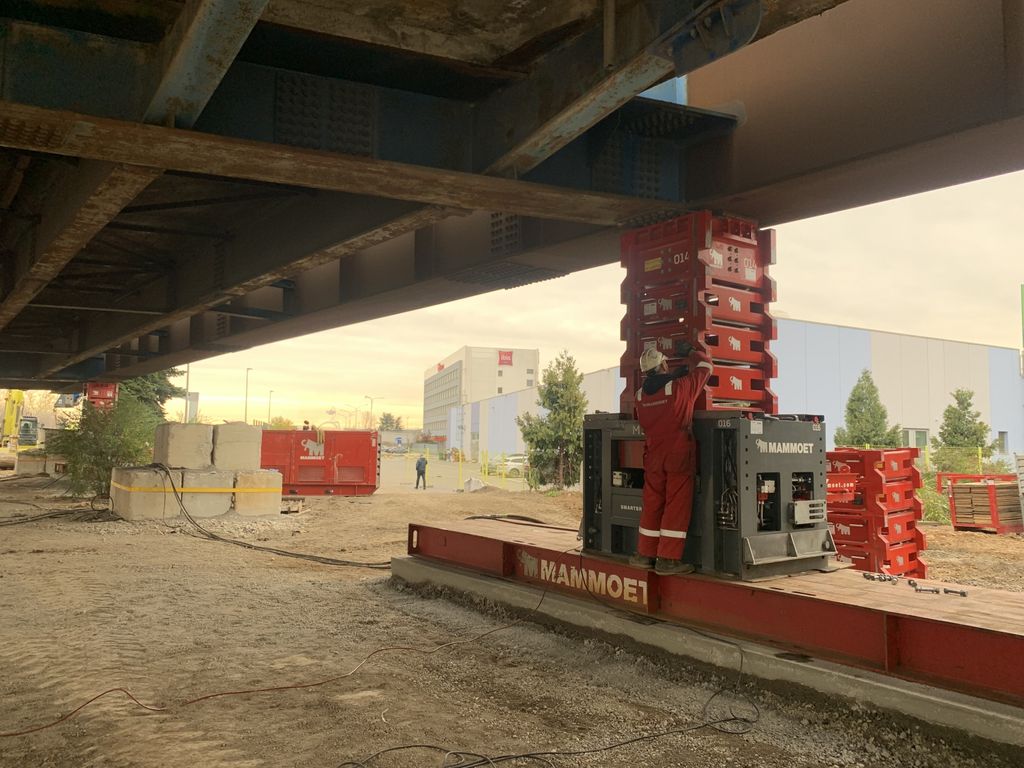 La soluzione proposta da Mammoet Italy, che ha superato quelle di altre aziende, tutte più o meno basate sull’utilizzo di gru, si è focalizzata in partenza sul poco spazio disponibile e sull’elevato traffico dei tratti autostradali circostanti, che avrebbero imposto alle gru di lavorare di notte e con circolazione interrotta. Mammoet invece ha deciso di utilizzare la tecnologia MJS, grandi martinetti idraulici a torre basati su un sistema a cassette d’acciaio in grado di sollevare (e abbassare) grandi carichi in spazi limitati. Originariamente era infatti stata sviluppata per operare sulle chiatte da carico. La serie MJS, che comprende modelli da 300, 800 e 5200 tonnellate per torre, è caratterizzata dall’unità di potenza separata da quella di sollevamento, cui è collegata tramite cavi e tubazioni flessibili ad alta pressione, in questo modo occupando uno spazio molto limitato. Nel progetto di Lainate sono stati utilizzati quattro torri MJS 300, ciascuna in grado di portare 300 tonnellate. Piazzate ai quattro angoli della struttura e in sagoma, le quattro torri si sono alzate progressivamente sino a assumere il carico del sovrappasso e alzarlo di 30 centimetri per staccarlo completamente dai supporti provvisori. Dopo una pausa per permettere l’installazione di nuovi supporti alti due metri, è iniziata l’operazione di abbassamento, durata circa due ore. I lavori si sono svolti tutti durante il giorno e dal momento in cui i tecnici Mammoet sono giunti sul cantiere a quando ne sono usciti sono passate 72 ore. Non appena sgomberato il campo, l’appaltatore ha iniziato immediatamente le operazioni di demolizione.