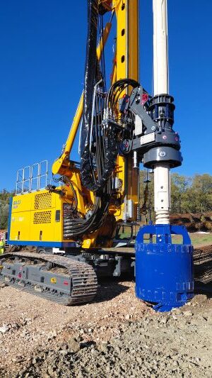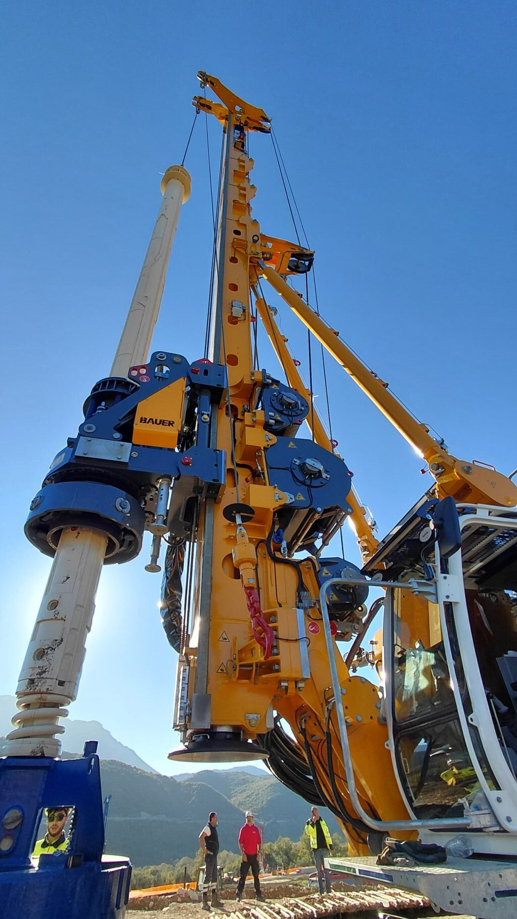Le prestazioni della BG23V parlano di una coppia effettiva di 235 kNm con un asse di perforazione 1.000, quindi maggiorato rispetto alla sorella BG23H e questo permette di affrontare diametri fino a 1.400 mm in caso di palo rivestito e di 1.700 mm non intubato, con aste Kelly che variano dalle classiche corte da 21-24 m fino ad aste da 44 m. Essendo una macchina della gamma Premium Line, la BG23V oltre al palo trivellato può eseguire molteplici tecnologie come CFA, FDP e Soil Mix colonnare. Con 65 t di peso operativo, la BG23V messa a disposizione da Bauer Macchine Italia è equipaggiata con tutti gli ultimi sistemi di supporto allo scavo: il sistema di tiro combinato con gli argani nell’estrazione del rivestimento, il sistema di visualizzazione delle tasche dell’asta Kelly per evitare danneggiamenti durante lo scavo ed l’interfaccia B Tronic di ultima generazione. Da segnalare la possibilità di installare la nuova funzione Stability Plus che regola in maniera automatica la velocità della ralla in rotazione in base al tipo di palo in esecuzione. Si tratta di una nuova funzione di sicurezza che permette di avere sempre la massima velocità di rotazione della ralla nel range di sicurezza e non richiede all’operatore nessun settaggio, ma solo l’indicazione del diametro del palo e degli elementi in uso. Infine, la BG23V è equipaggiabile anche con il pacchetto super-ribassato, cioè con un’antenna ad altezza ridotta e una rotary a cestello maggiorato, per realizzare pali trivellati anche sotto gli 8 m di limite altezza operativa macchina.