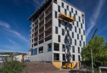 L’operatore della gru David Hartung ha accuratamente infilato le scale prefabbricate e altri componenti nell’edificio e li ha collocati in posizione. “Un grande team e una gru fantastica: tutto è andato liscio“, riferisce Hartung con soddisfazione. Tuttavia, il sito ristretto rappresentava comunque una sfida. Andreas Meyer, di Sommer Kranverleih, spiega: “Lo spazio a disposizione in cantiere era estremamente limitato. Fortunatamente, il raggio di zavorra della LTM 1450-8.1 può essere ridotto per gestire queste situazioni. Senza VarioBallast® non avremmo avuto alcuna possibilità“. Il raggio di zavorra sulla gru Liebherr da 450 tonnellate può essere regolato all’infinito tra i cinque e i sette metri utilizzando un semplice meccanismo idraulico.